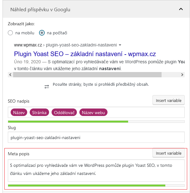 Na níže uvedených obrázcích vidíte zobrazení meta description ve vyhledávači Google (vlevo) a nastavení meta description v administraci WordPress pomocí pluginu Yoast SEO, který vám vytvoří widget pod každým článkem, kde upravujete mnoho SEO parametrů. Trochu matoucí je ten český překlad „Meta popis“, nechali bychom tam i v češtině meta description.