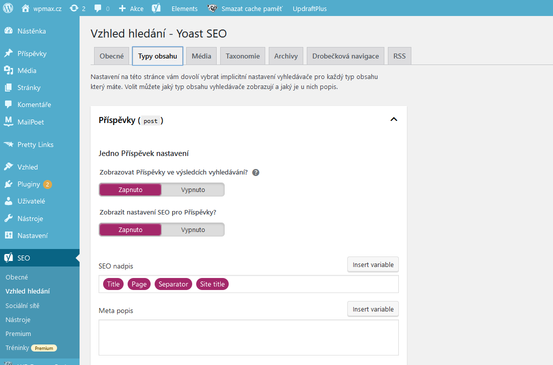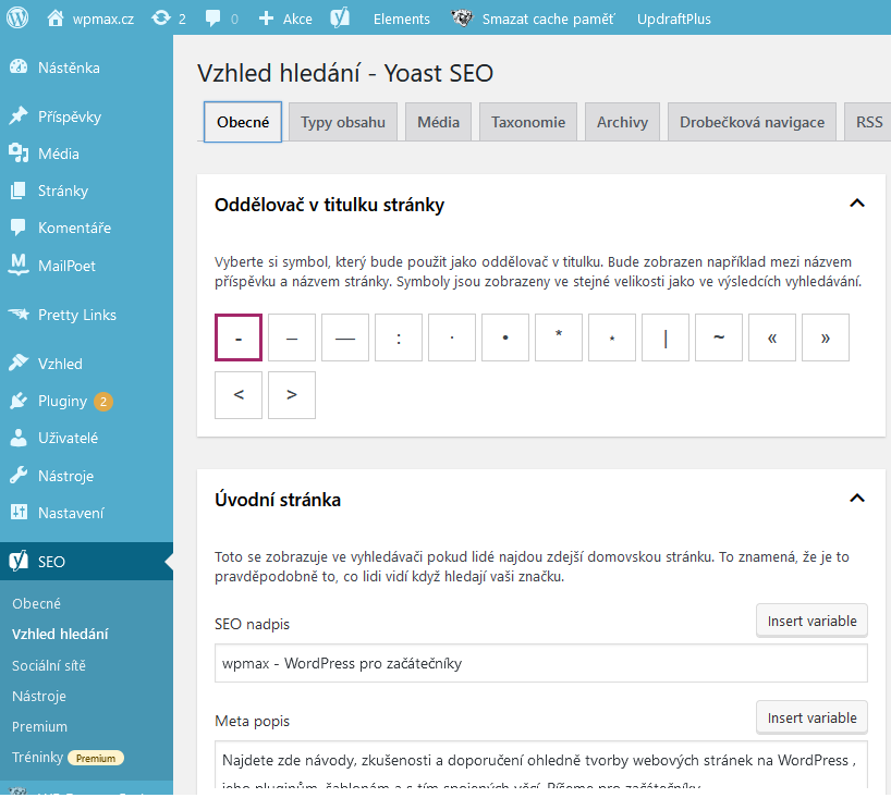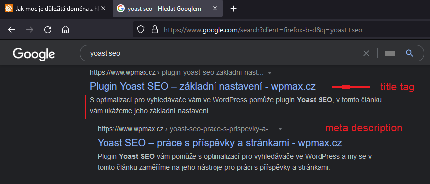 Také zde můžete vidět, že title tag na wpmax se automaticky tvoří z názvu článku a domény wpmax.cz. Používáme na to plugin Yoast SEO. Níže v článku vám ukážeme, jak to máme na wpmax.cz nastaveno.