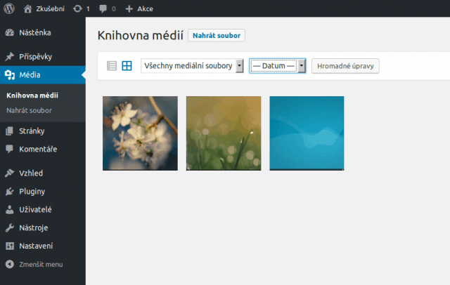 Obrázky se spravují v administraci v sekci Média, ale nahrát obrázek můžete přímo ze stránky, kde píšete nový příspěvek. Obrázky (a jiná média) se v sekci Média nahrávají pomocí tlačítka Nahrát soubory vedle nadpisu Knihovna médií. Nahrávat můžete i několik souborů najednou, jako je tomu na obrázku. Pokud nahrajete obrázky přímo do Knihovny médií, obrázky potom můžete do příspěvku vložit později přímo ze stránky, kde píšete příspěvek.