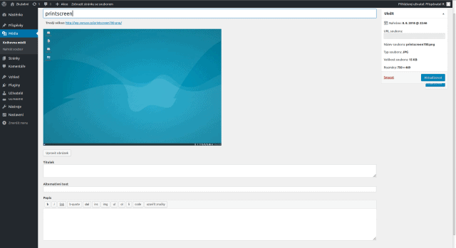 Velikost obrázku – poté, co nahrajete obrázek do knihovny médií, WordPress automaticky vytvoří až tři další (menší) velikosti toho samého obrázku pro další možná využití. Tyto níže vyjmenované velikosti si můžete individuálně změnit v administraci přes Nastavení > Média. Po nahrání jednoho obrázku vzniknou až čtyři verze obrázku: