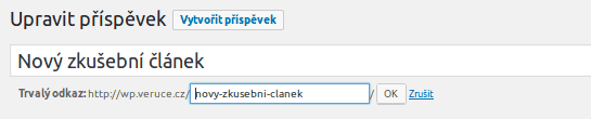 WordPress generuje název v URL automaticky podle názvu článku. Zde můžete upravit název článku v adrese, tedy podobu tzv. trvalého odkazu. To se hodí např. u dlouhých názvů článků, které v adrese můžete zkrátit. Dále tuto možnost využijete v případě, kdy změníte název článku, ale název v trvalém odkazu zůstane původní. Stejný efekt má úprava pod názvem článku – Trvalý odkaz.