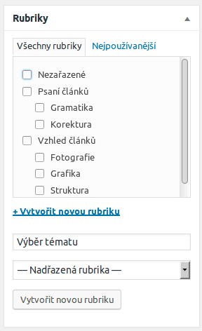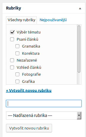 Rubriky, jinak řečeno kategorie, slouží nejen pro čtenáře k základnímu třídění příspěvků podle témat. Můžete vytvořit i vnořené rubriky (na obrázku níže je rubrika Gramatika vnořená pod rubriku Psaní článku). Základní rubrikou je Nezařazené (lze to změnit). Nové rubriky můžete přidat přímo u rozepsaného článku nebo přes menu Příspěvky > Rubriky. Vybrané rubriky se (po uložení konceptu) zobrazí na prvních místech, stejně tak rubriky nové.